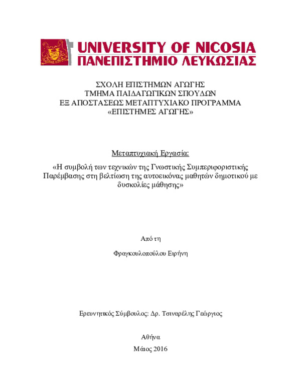 Η παρούσα μεταπτυχιακή εργασία δοκιμάζει τη διερεύνηση της πιθανής συμβολής συγκεκριμένων τεχνικών της Γνωστικής Συμπεριφοριστικής Παρέμβασης, προς την κατεύθυνση θετικής τροποποίησης δυσλειτουργικών πεποιθήσεων, σχετιζόμενων με την αυτοεικόνα, παιδιών με δυσκολίες μάθησης. Οι εν λόγω τεχνικές εφαρμόστηκαν από τους ίδιους τους εκπαιδευτικούς των τάξεων, έπειτα από σχετική επιμόρφωση που τους έγινε, ενώ απευθύνονταν στο σύνολο των μαθητών.