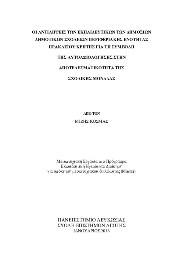 Οι αντιλήψεις των εκπαιδευτικών των Δημόσιων Δημοτικών Σχολείων Περιφερειακής Ενότητας Ηρακλείου Κρήτης για τη συμβολή της Αυτοαξιολόγησης της Αποτελεσματικότητας της Σχολικής Μονάδας