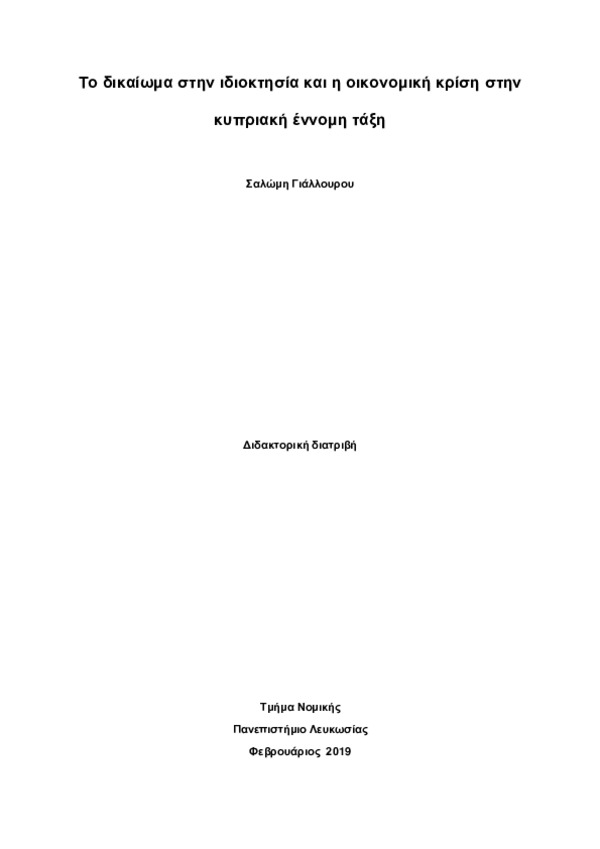 From 2009 onwards, the Republic of Cyprus faced the greatest economic crisis of its modern history. In the context of confronting this crisis, it adopted a series of measures, related -at least prima facie- to the right to property. An inevitable question was whether these measures were in line with the right at issue. The answer could not be a reflective one. On the contrary, on the one hand it was required to define the theoretical and positive framework of the protection of the right to property in the Cypriot legal order and, on the other, to assess these measures with reference to this right. The present study hopes to answer the above basic question by examining the additional issues that surround it. Initially, a theory for the protection of the right to property is proposed. Thereafter, the positive framework of its protection is set forth, as this results from Article 1 of the First Additional Protocol to the ECHR and Article 23 of the Constitution, evaluated and interpreted under the assertions of the proposed theory. Lastly, the conformity of measures adopted by the Republic of Cyprus is examined, both with respect to the proposed theory as well as with the above-mentioned positive framework. In particular, under observation is the compatibility with the right to property of the imposition of special contribution and reduction on the salaries and pensions of the employees and pensioners of the public sector, the impairment and/or conversion into shares of the deposits of the Cyprus Popular (Laiki) Bank and the Bank of Cyprus account holders (deposits haircut) and the release of principle debtors and guarantors from their obligations against the banks. Its purpose is to offer something new to the legal and non-legal, research and non-research world∙ to provide stimulus for further debate, exploration and thought.