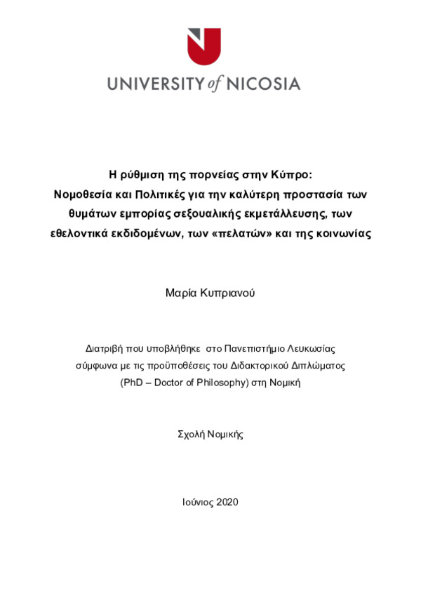 Η διατριβή ερευνά τη ρύθμιση της πορνείας στην Κύπρο1 και την επίδρασή της στο φαινόμενο της εμπορίας προσώπων για σκοπούς σεξουαλικής εκμετάλλευσης. Στόχος είναι να απαντηθούν ερωτήματα που αφορούν στην ύπαρξη της πορνείας στην Κύπρο, την αντιμετώπιση του πελάτη/χρήστη υπηρεσιών, την αντίδραση της κοινωνίας στην ποινικοποίηση ή τη νομιμοποίηση της πορνείας και στη διερεύνηση του ενδεχόμενου εφαρμογής ενός μοντέλου ρύθμισης της πορνείας στην Κύπρο, όπου θα προστατεύονται τα δικαιώματα του θύματος σεξουαλικής εκμετάλλευσης, της εκδιδομένης, του πελάτη και της τοπικής κοινωνίας.