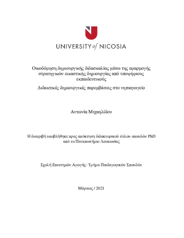 Οικοδόμηση δημιουργικής διδασκαλίας μέσω της εφαρμογής στρατηγικών εικαστικής δημιουργίας από υποψήφιους εκπαιδευτικούς . Διδακτικές δημιουργικές παρεμβάσεις στο νηπιαγωγείο