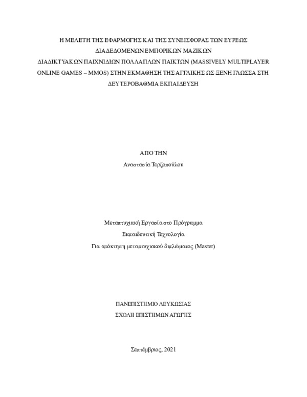 Περιγραφή: The Implementation and Contributtion of Massively Multiplayer Online Games in Learning English as a Foreign Language in Secondary Education.pdf (pdf) Ξεφύλλισμα pdf