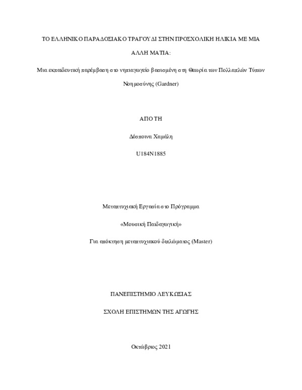 Το Ελληνικό παραδοσιακό τραγούδι στην προσχολική ηλικία με μια άλλη ματιά: Μια εκπαιδευτική παρέμβαση στο νηπιαγωγείο βασισμένη στη θεωρία των πολλαπλών τύπων νοημοσύνης (Gardner)