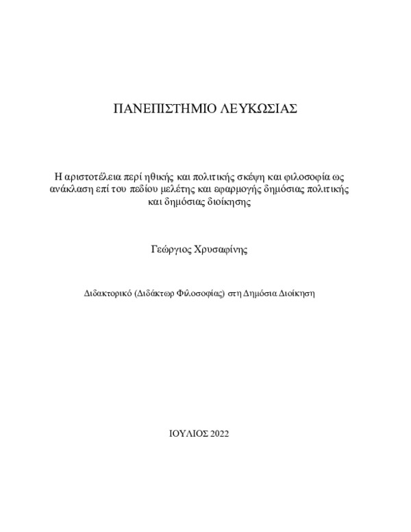 The aim of this doctoral dissertation is to explore the links between Aristotle’s practical philosophy and the fields of exercising public administration and shaping public policy. Practical philosophy is a term that implies that the emphasis on philosophy should be placed on the values and attitudes of life, as well as on norms of behaviour. Practical philosophy, a cognitive area sufficiently identified by the Stagirite, is directly linked to the two main dimensions of human collective action, namely ethics and politics. In fact, Aristotle’s relevant writings consists a treatise on the relationship between ethics and politics of an organized society, which focused on how people should govern or should be governed. In other words, how public administration should be exercised and how public policy should be implemented.