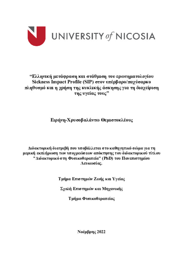 “Ελληνική μετάφραση και στάθμιση του ερωτηματολογίου Sickness Impact Profile (SIP) στον υπέρβαρο/παχύσαρκο πληθυσμό και η χρήση της κυκλικής άσκησης για τη διαχείριση της υγείας τους