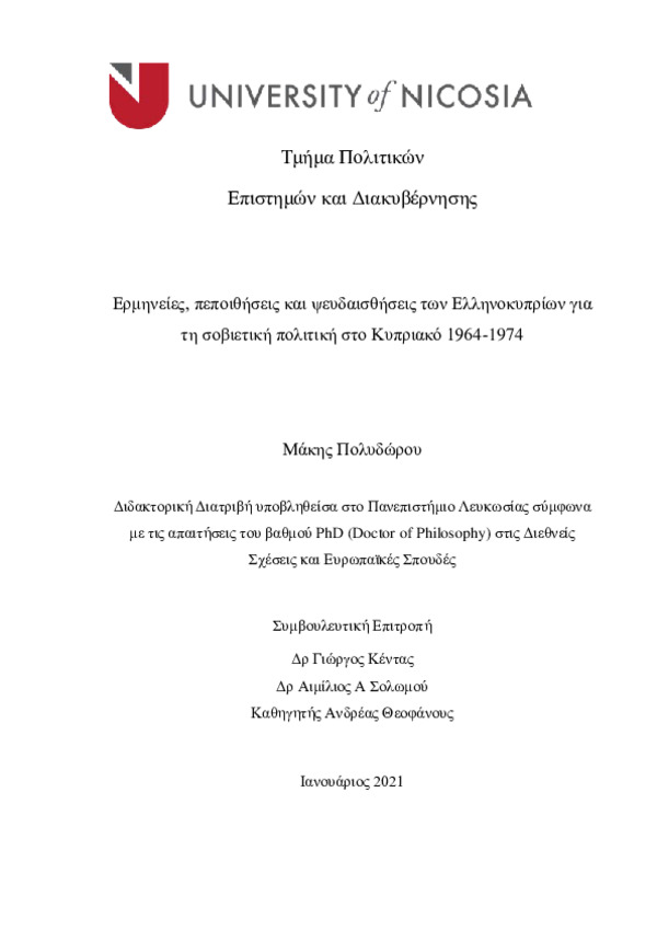 Ερμηνείες, πεποιθήσεις και ψευδαισθήσεις των Ελληνοκυπρίων για τη σοβιετική πολιτική στο Κυπριακό 1964-1974.