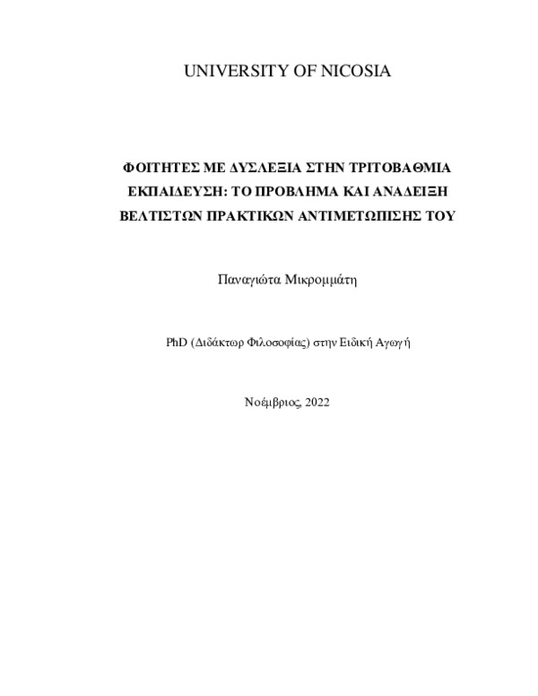 • Ο όξνο εηδηθή καζεζηαθή δπζθνιία-δπζιεμία αλαθέξεηαη ζηηο ζνβαξέο δπζθνιίεο πνπ αληηκεηωπίδνπλ νξηζκέλα άηνκα ζηε ρξήζε θαη θαηαλόεζε ηνπ γξαπηνύ ιόγνπ. Οη πεξηζζόηεξεο έξεπλεο κε επίθεληξν ηελ ελ ιόγω εηδηθή καζεζηαθή δπζθνιία, εζηηάδνληαη θπξίωο ζηελ πξωηνβάζκηα θαη δεπηεξνβάζκηα εθπαίδεπζε θαη ειάρηζηεο έρνπλ αζρνιεζεί κε ηελ ηξηηνβάζκηα. Κάζε ρξόλν έλαο απμαλόκελνο αξηζκόο θνηηεηώλ, κε εηδηθέο εθπαηδεπηηθέο αλάγθεο, αξρίδεη ηε θνίηεζή ηνπ ζηελ ηξηηνβάζκηα εθπαίδεπζή. Λόγω ηνπ όηη νη θνηηεηέο κε δπζιεμία, αλακέλεηαη λα επηηύρνπλ ηνπο ίδηνπο ζηόρνπο κε ηνπο ζπλνκειίθνπο ηνπο, είλαη ζεκαληηθό γηα απηνύο λα γλωξίδνπλ πώο κπνξνύλ λα βειηηώζνπλ ηελ απόδνζε ηνπο θαη πνηα είδε ζηήξημεο γηα ηνπο ηδίνπο είλαη ρξήζηκα. Σθνπόο ηεο παξνύζαο έξεπλαο, είλαη ε δηεξεύλεζε ηνπ πξνβιήκαηνο ηωλ θνηηεηώλ κε δπζιεμία ηξηηνβάζκηαο εθπαίδεπζεο ζηελ Κύπξνπ θαη ε αλάδεημε βέιηηζηωλ πξαθηηθώλ αληηκεηώπηζήο ηνπ ωο θξηηήξηα ειέγρνπ ηεο πνηόηεηαο εθπαίδεπζεο ηωλ θνηηεηώλ κε δπζιεμία. Τν δείγκα ηεο έξεπλαο απνηειείηαη από 280 θνηηεηέο κε δπζιεμία ηωλ Παλεπηζηεκίωλ Κύπξνπ θαη από 280 αθαδεκαϊθνύο δαζθάινπο ηωλ ηδίωλ Παλεπηζηεκίωλ. Πξαγκαηνπνηήζεθαλ εκη-δνκεκέλεο ζπλεληεύμεηο κε ηε ρξήζε θιίκαθαο θαη ηεο αλάδεημεο δηιεκκάηωλ επηινγώλ, δόζεθαλ εξωηεκαηνιόγηα θαη ηα απνηειέζκαηα αλαιύζεθαλ κε ηελ κέζνδν αλάιπζεο πεξηερνκέλνπ θαη ηε ρξήζε ηνπ ζηαηηζηηθνύ πξνγξάκκαηνο SPSS.