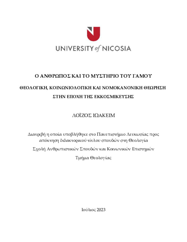 The present thesis attempts to locate the position of the canon law of marriage and the sacrament of marriage in general, in the contemporary world, given the current social and philosophical setting. At first, the biblical anthropology regarding the relations of the two sexes is approached from the perspective of patristic hermeneutic tradition, surrounding the story of the creation and fall of the first couple. Then, by analysing the theology of the New Testament and the liturgical tradition surrounding the sacrament of marriage, an attempt is made to present the theological tradition of the Eastern Orthodox Church in relation to this great ecclesiastical sacrament. By comparing the orthodox liturgical and wider theological tradition on the subject of marriage, to the Latin scholastic theology and the consequent modern era philosophical tradition, the concept of “secularisation” is approached from a theological perspective. The comparison of the history of the two traditions leads to the conclusion that the later tradition expresses an evolving secularisation of theological thought, with the expected consequences on church life. Furthermore, the thesis explores the basic principles of Christian ethics in relation to the subject of marriage and the relations of the two sexes. The thesis seeks the reasons behind the crisis which the universal institution of marriage is undergoing and the connection between those reasons and the phenomenon of secularisation. Comparing the positions taken by the intertemporal living orthodox tradition regarding these matters, to the corresponding positions of the theological traditions of western Christianity, which often prove to be harsh and lead to a standstill, the thesis explores the role of orthodox theology and the sacrament of marriage in the contemporary “post-modern” society. The last part of the thesis focuses on matters relating to the canon law of marriage. The thesis explores the question of the position of the canon law of marriage in the contemporary social and legal reality. It further explores specific contemporary challenges to the canon law of marriage, such as the institution of civil marriage, the issue of “mixed” marriages, as well as the issue of the second marriage of clergymen and the challenges relating to the dissolution of marriage and the entrance into a new marriage.