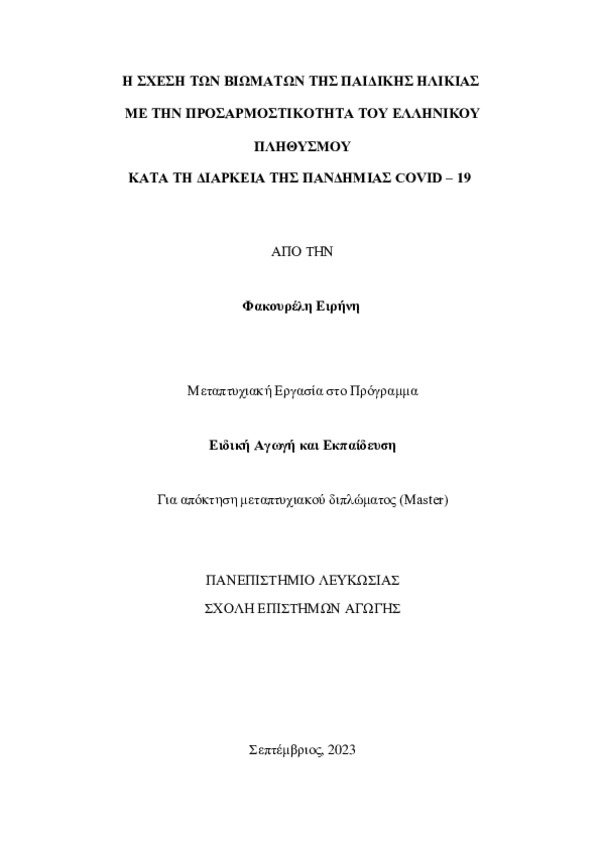 Η σχέση των βιωμάτων της παιδικής ηλικίας με την προσαρμοστικότητα του ελληνικού πληθυσμού κατά τη διάρκεια της πανδημίας covid – 19
