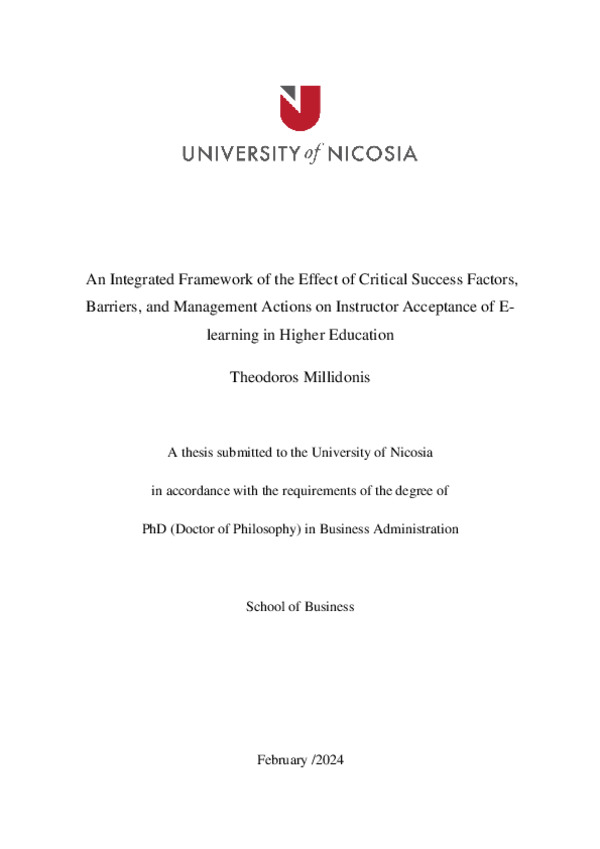 • This Thesis explores the role of institutional management actions on instructors’ acceptance of e-learning as a viable mode of course delivery in higher education. Specifically, this study examines the effect of higher education instructor perceptions of e-learning critical success factors, barriers, and associated management actions on instructors’ motivation to accept and engage in e-learning in the higher education industry. Initially, the Thesis engages in a narrative and systematic literature review analysis, after which a preliminary conceptual framework is created, that identifies existing knowledge and gaps, and leads to its empirical testing in the Cyprus higher education sector. The primary research follows a critical realism point of view and methodologically uses a qualitative technique. Semi-structured interviews were used as the method for collecting qualitative research data for this study, and 20 informants took part. By identifying patterns, themes, and subthemes, the data are analyzed using the thematic template analysis technique. On the basis of these and taking into account all significant empirical findings, the final conceptual framework has been constructed and displayed. The research results pinpoint the positive outcomes of supportive institutional management actions on instructor acceptance of e-learning; themselves associated with addressing the issues of enabling e-learning critical success factors to be achieved, and mitigating negative effects associated with this mode of course delivery. Further, it is found that the positive effects of appropriate institutional management actions on instructor acceptance of e-learning is mediated by intrinsic and extrinsic motivation factors, arising as a result of these actions. Instructor perceptions toward institutional management actions are generally positive and the research shows that this contributes towards instructors’ positive views of e-learning and willingness to adopt it. Results also show that if instructors do not perceive institutional management actions positively, 3 this will not lead to outright rejection of e-learning, however instructors will not be positively reinforced toward accepting, engaging with, and committing to e-learning on a continual basis. By and large, the research's conclusions provide significant contributions to both theory and practice. As an academic contribution to knowledge, the experimentally validated final framework defines the positive outcomes associated with instructor acceptance of e-learning and uncovers original correlations between e-learning management and instructor views, with benefits for the wider higher education e-learning environment. It establishes the framework for producing both internal and external advantages for higher education institutions. Internal institutional benefits are tied to the improvement of e-learning quality and the increase of instructor motivation for its acceptance. This in turn leads to tangible external benefits as well since educational quality is one of the main factors affecting a higher education institution’s reputation and brand image.