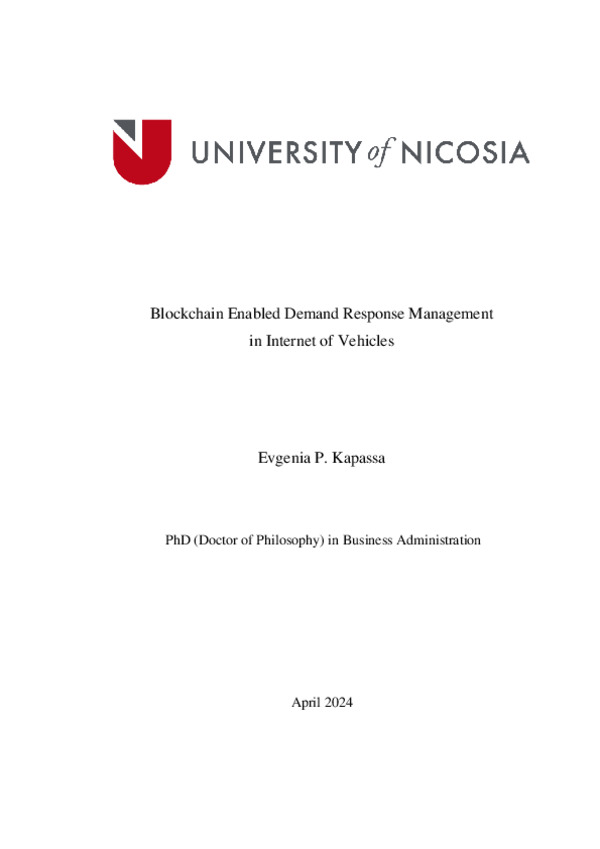 This dissertation investigates the integration of blockchain technology within the domain of Demand Response Management (DRM) in the Internet of Vehicles (IoV). The study is driven by the increasing integration of Electric Vehicles (EVs) into the energy ecosystem and a growing emphasis on decentralized energy resources. The aim of this study is to investigate the use of blockchain, as a technology for enhancing DRM in the IoV, addressing challenges related to energy management and secure data handling. Electric vehicles have potential as decentralized energy storage systems, yet there are ongoing issues to be addressed, including DRM, managing the equilibrium of energy supply and coordinating the charging process. Centralized charging systems, currently in use, are limited in effectiveness and raise concerns about transparency and privacy. Blockchain technology emerges as a potential solution for these issues, yet its application in real-world IoV settings for privacy preservation and incentivizing participation is underexplored. Additionally, there is a notable absence of personalized EV charging strategies in existing studies, highlighting the need for empirical research on the effectiveness of blockchain-based DRM and personalized charging approaches in the IoV context. To bridge this gap, a novel blockchain-based conceptual model for DRM in IoV is proposed. This model emphasizes tokenized incentives, user-centric profiles, adaptive charging schedules, bi-directional Peer-to-Peer (P2P) energy trading and privacy through blockchain capabilities. The research adopts an interpretivist stance and a qualitative methodological approach, utilizing a multiple case study strategy to evaluate the proposed model. Four case studies, including organizations from both the academic and the industry area, provide rich empirical data. While the empirical evidence supports the conceptual validity of the proposed model, it also reveals recommendations for further enhancement. Therefore, the proposed conceptual model is refined based on the empirical findings. This research makes significant advancements, introducing a novel Blockchain-Enabled DRM Model for IoV, addressing key challenges in the field. This model is distinguished by its holistic approach, combining tokenized incentives, bi-directional P2P energy trading and user-centric profiles. The incorporation of blockchain not only enhances data security and transparency but also introduces a novel approach to incentivizing user participation through tokenized rewards. The model’s emphasis on personalized EV charging strategies, based on user profiles, represents a significant leap in aligning DRM with individual user needs and behaviours. Additionally, the research introduces user-centric and blockchain-enabled DRM strategies. By centring the DRM process around the user, the study addresses a crucial gap in existing literature. Finally, the thesis incorporates environmental considerations into the DRM model, a novel aspect of the study. It addresses the energy consumption associated with blockchain technology and integrates renewable energy sources, aligning DRM practices with environmental sustainability goals. In summary, this thesis extends the body of knowledge and contributes to the progress of blockchain technology in the context of IoV DRM, through a novel model development, empirical validation, user-centric approaches, and sustainability considerations.
