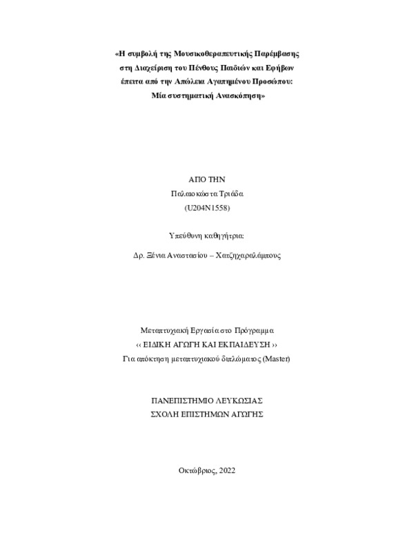 Η συμβολή της Μουσικοθεραπευτικής Παρέμβασης στη Διαχείριση του Πένθους Παιδιών και Εφήβων έπειτα από την Απώλεια Αγαπημένου Προσώπου