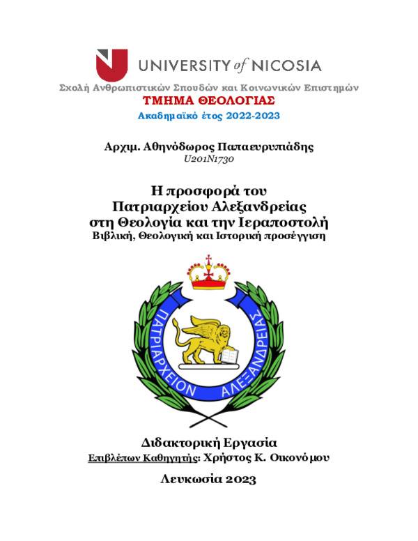 - The Contribution of the Patriarchate of Alexandria to Theology and Mission Biblical, Theological and Historical Approach
