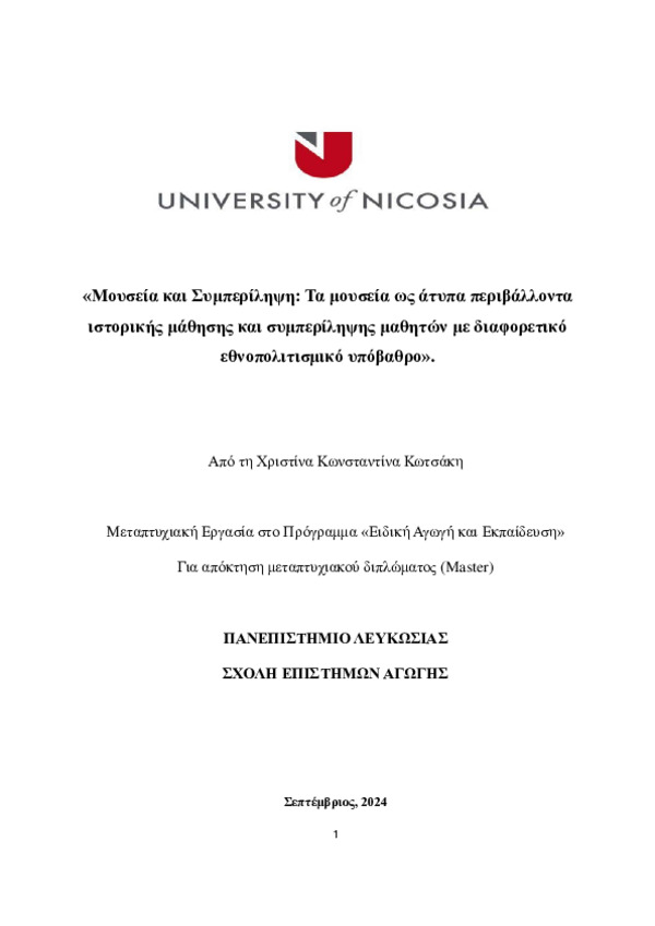 Μουσεία και Συμπερίληψη: Τα μουσεία ως άτυπα περιβάλλοντα ιστορικής μάθησης και συμπερίληψης μαθητών με διαφορετικό εθνοπολιτισμικό υπόβαθρο