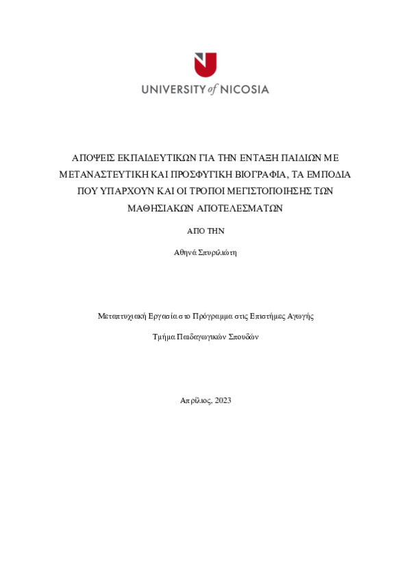 Αποψεις εκπαιδευτικων για την ενταξη παιδιων με μεταναστευτικη και προσφυγικη βιογραφια, τα εμποδια που υπαρχουν και οι τροποι μεγιστοποιησης των μαθησιακων αποτελεσματων