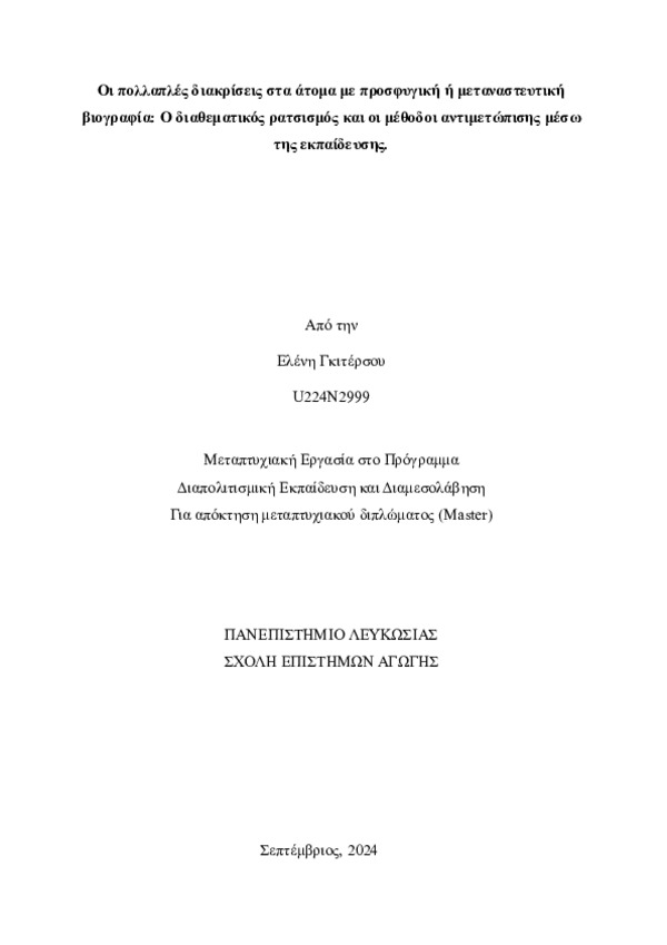 Οι εμπειρίες των προσφύγων και των μεταναστών είναι σύνθετες, πολύπλευρες και επηρεάζονται από μια σειρά πολλαπλών, διαθεματικών ταυτοτήτων, όπως η φυλή, το φύλο, η εθνικότητα και η ηλικία. Η παρούσα βιβλιογραφική ανασκόπηση διερευνά τη διαθεματικότητα του ρατσισμού σε βάρος των προσφύγων και των μεταναστών, αποκαλύπτοντας τους τρόπους με τους οποίους οι πολλαπλές διαστάσεις της ταυτότητας αλληλεπιδρούν και καθορίζουν τις εμπειρίες των προσφύγων και μεταναστών. Η συλλογή δεδομένων από μετανάστριες αλλά και εκπαιδευτικούς επιβεβαίωσε όσα υποστηρίζονται από τη σχετική βιβλιογραφία σχετικά με τα περιστατικά διαθεματικού ρατσισμού. Όπως διαπιστώθηκε από την ανάλυση αυτών, η εκπαίδευση αποτελεί εργαλείο εξάλειψης ρατσιστικών συμπεριφορών και συνεπώς περιστατικών διαθεματικού ρατσισμού. Μέσω αυτής, τα παιδιά καλλιεργούν την ενσυναίσθηση, γνωρίζουν νέους πολιτισμούς και κουλτούρες και αναπτύσσουν καλές σχέσεις μεταξύ τους.