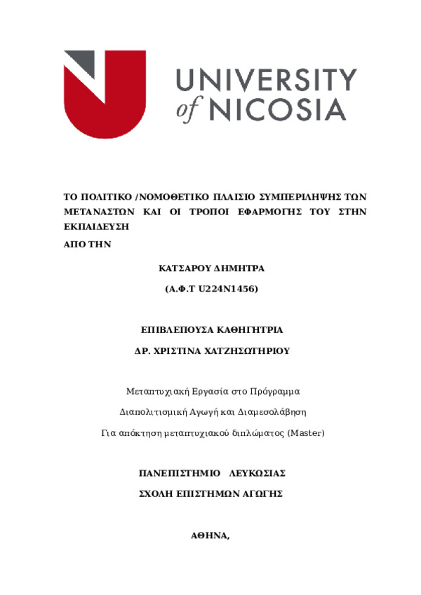 Το πολιτικο/ νομοθετικο πλαισιο συμπεριληψης των μεταναστων και οι τροποι εφαρμογης του στην εκπαιδευση