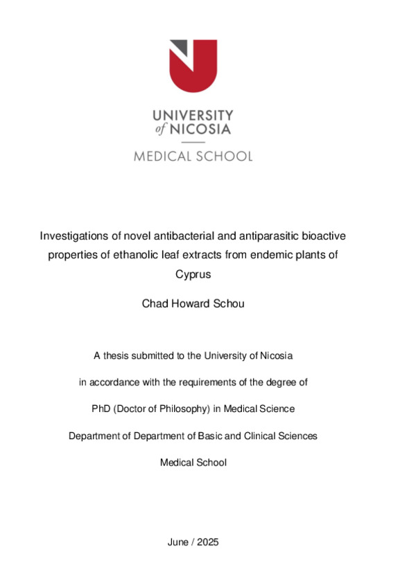 Investigations of novel antibacterial and antiparasitic bioactive properties of ethanolic leaf extracts from endemic plants of Cyprus