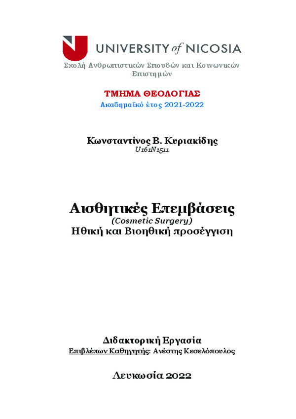 Η διατριβή διερευνά τις πολυδιάστατες ηθικές και βοηθικές προεκτάσεις των αισθητικών επεμβάσεων, με αυξημένη διάδωση στις σύγχρονες κοινωνίες.