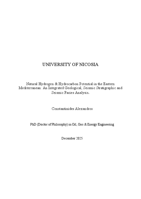 Natural Hydrogen & Hydrocarbon Potential in the Eastern Mediterranean: An Integrated Geological, Seismic Stratigraphic and Seismic Facies Analysis. - Identifier: 6245