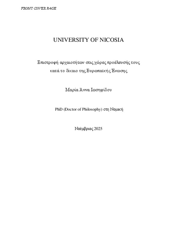 This dissertation provides an in-depth examination of the current legal framework, both European Union and international, governing the protection and return of cultural goods to their countries of origin. The central research question addresses the extent to which the existing EU framework promotes and strengthens the claims of states seeking the restitution of their cultural property. It also investigates its effectiveness in preventing and combating the illicit trafficking of such items. Specifically, the study shows that the free movement of goods within the Single Market, although a fundamental principle of the Union, may inadvertently facilitate the illicit trade of cultural goods when not accompanied by adequate control mechanisms. Illicit trafficking undermines national sovereignty, damages the historical and cultural identity of states, and deprives societies of access to their cultural heritage. Moreover, it has evolved into a form of transnational crime, linked to organized crime, money laundering, and the financing of terrorist networks. In this context, the need for a coherent and effective legal framework becomes imperative. After presenting the nature and contemporary dimensions of the phenomenon, the dissertation focuses on the international legal framework, evaluating its functionality and its influence on policies developed by Member States and the European Union. Subsequently, the research concentrates on the EU legal framework, exploring the limits of its competence in the cultural domain, assessing the extent to which it has managed to balance the protection of cultural heritage with the smooth functioning of the Single Market, and evaluating the effectiveness of the procedures established for the return of cultural goods. Simultaneously, the complementary role of 4 the soft law is examined, highlighting its influence on the policies and practices of museums, art dealers, auction houses, and other market participants in ensuring the protection and restitution of cultural property. The findings indicate that, despite significant improvements in recent years, the implementation of these regulations continues to face substantial obstacles. The differing legal traditions of Member States—and, by extension, their varied approaches to cultural goods—the complexity of the art market, and the practical difficulties faced by the states in monitoring illicit trade and asserting claims over cultural goods all limit the effectiveness of the EU framework. The contribution of this dissertation is twofold: it analyzes these practical obstacles, legislative shortcomings, and challenges arising in the application of existing law, and it proposes specific institutional and regulatory interventions to strengthen the EU legal framework. Overall, the research concludes that, although meaningful progress has been achieved at both international and EU levels, the legal framework remains fragmented and incomplete. Accordingly, dynamic interventions are recommended to ensure the effective protection of cultural heritage and the unobstructed return of illicitly trafficked cultural goods to their countries of origin.